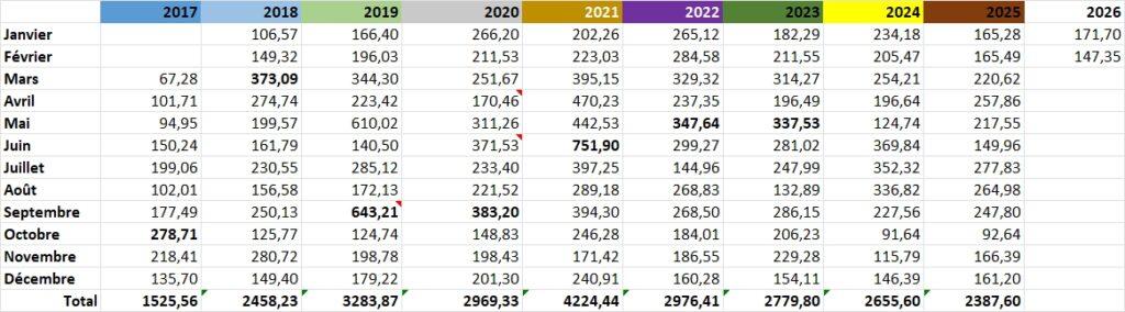 2019: Mai et septembre 2019 sont élevés car nous avons fait de belles sorties en vélo.