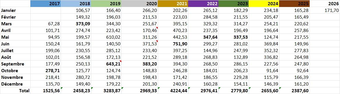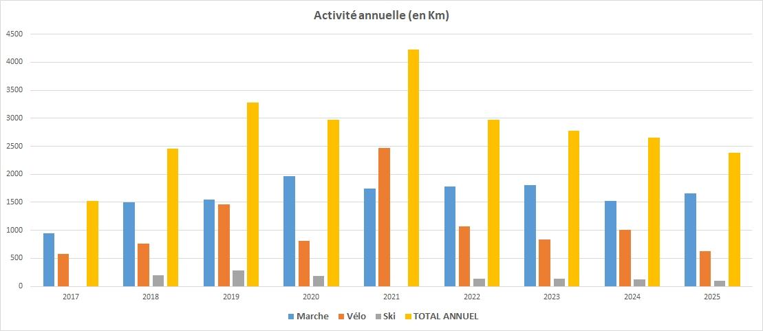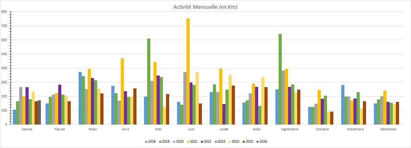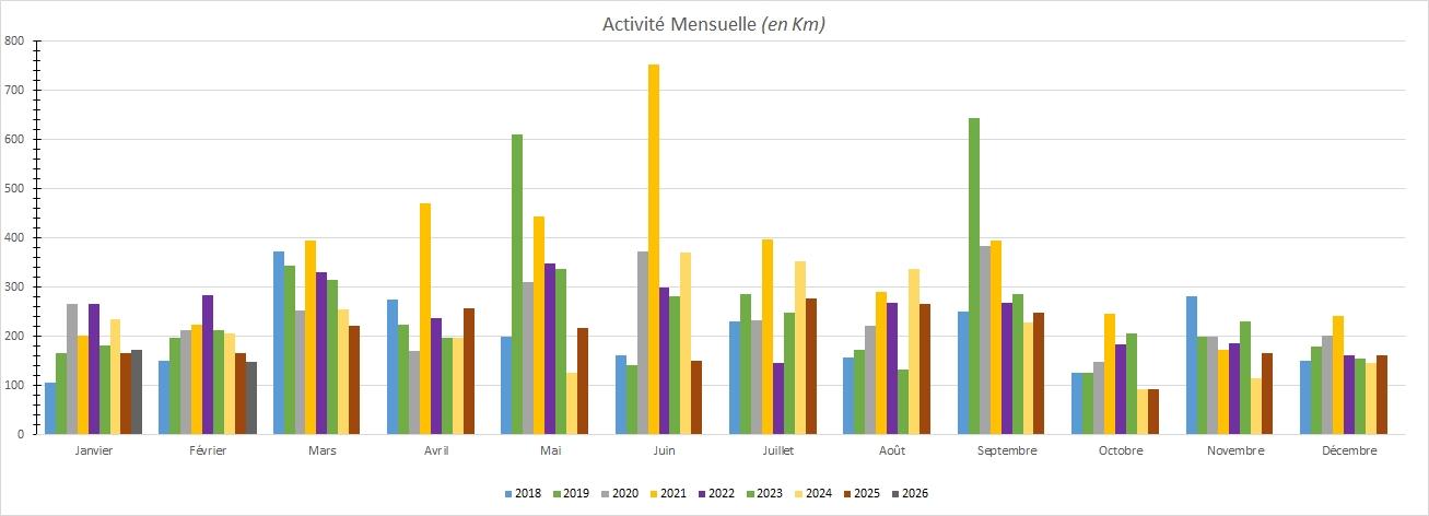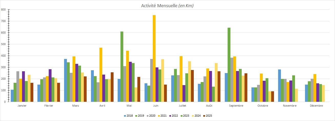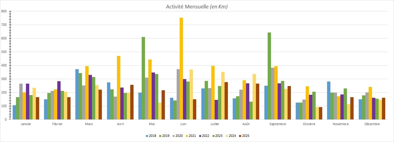2019: Mai et septembre 2019 sont élevés car nous avons fait de belles sorties en vélo.
